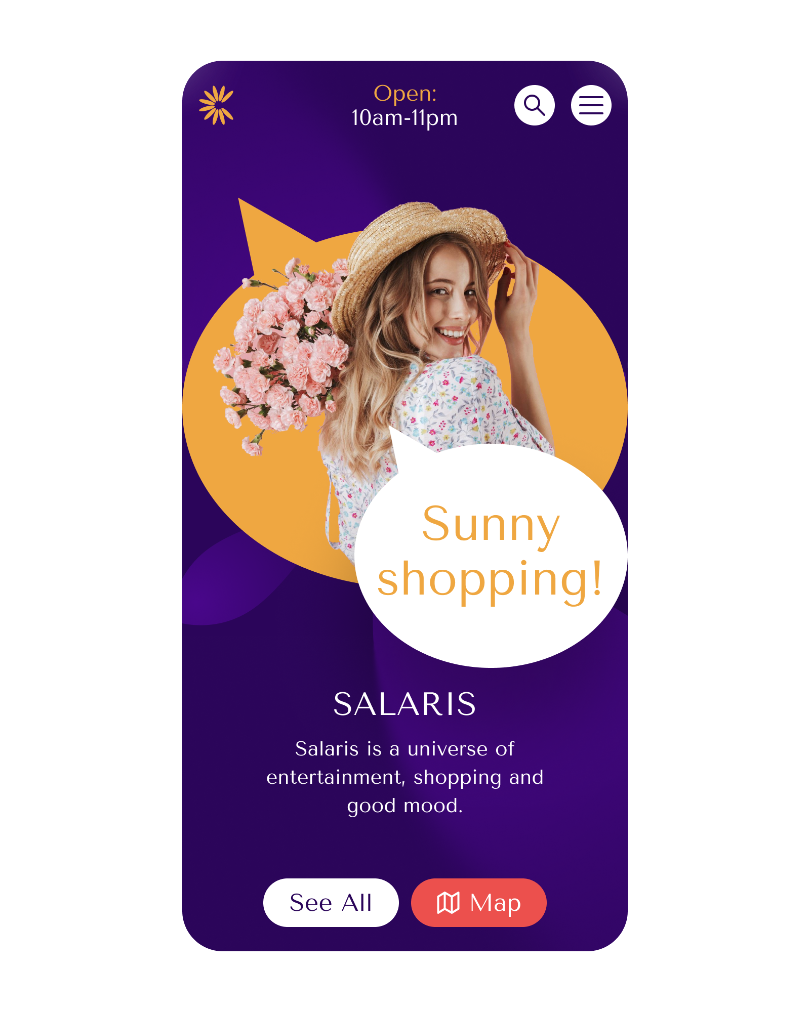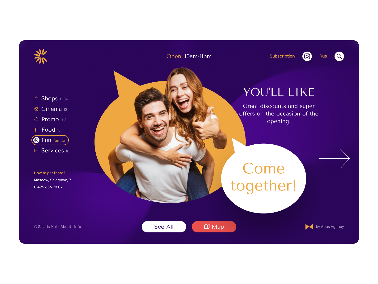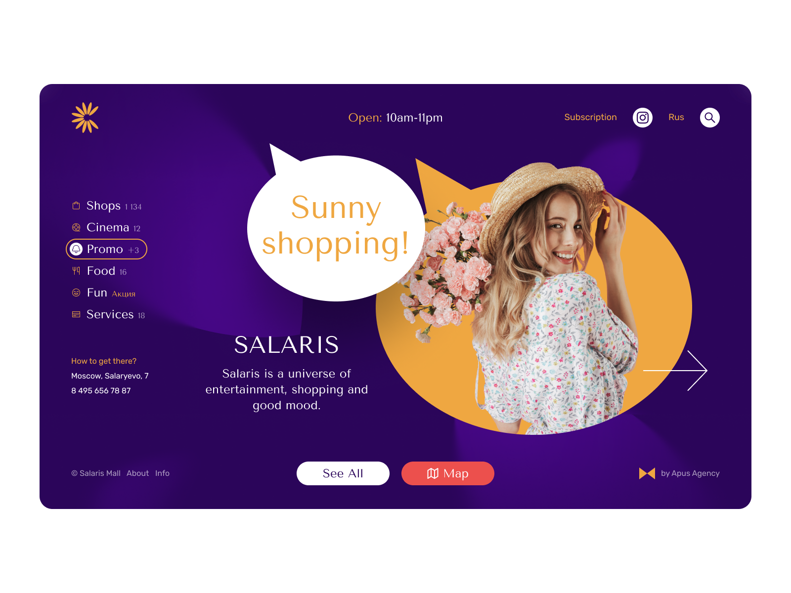 Salaris is a large shopping and entertainment center located in Salaryevo, New Moscow. By the opening of the mega mall, the agency, together with the client's team, created and launched a website with sections of shops, services, cinema, entertainments, interactive map and others.