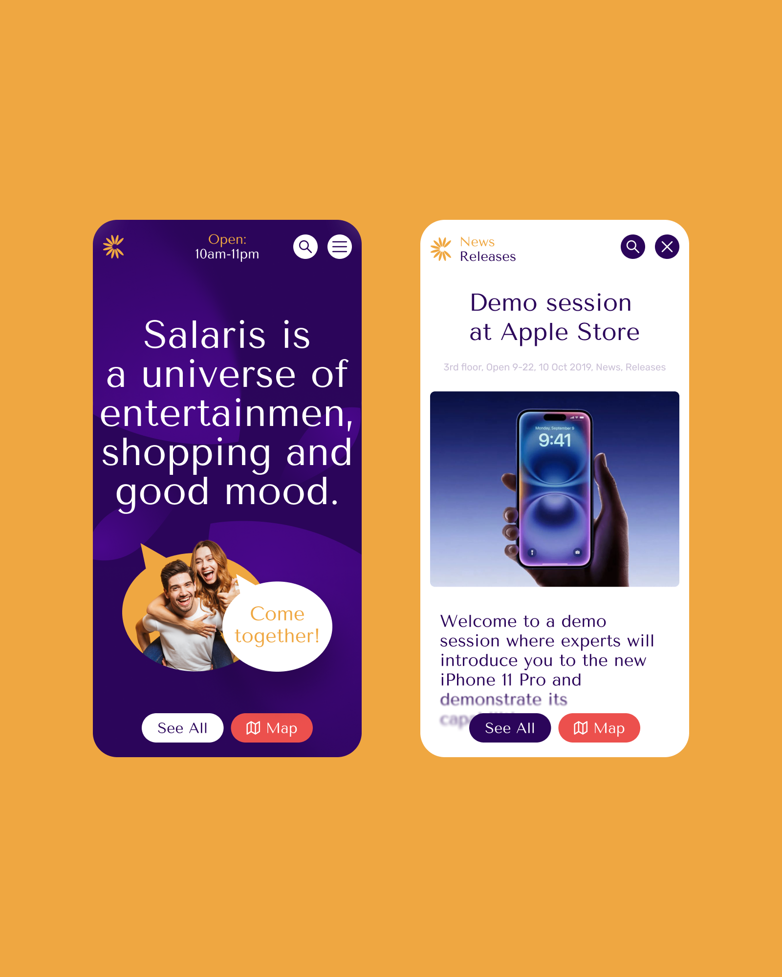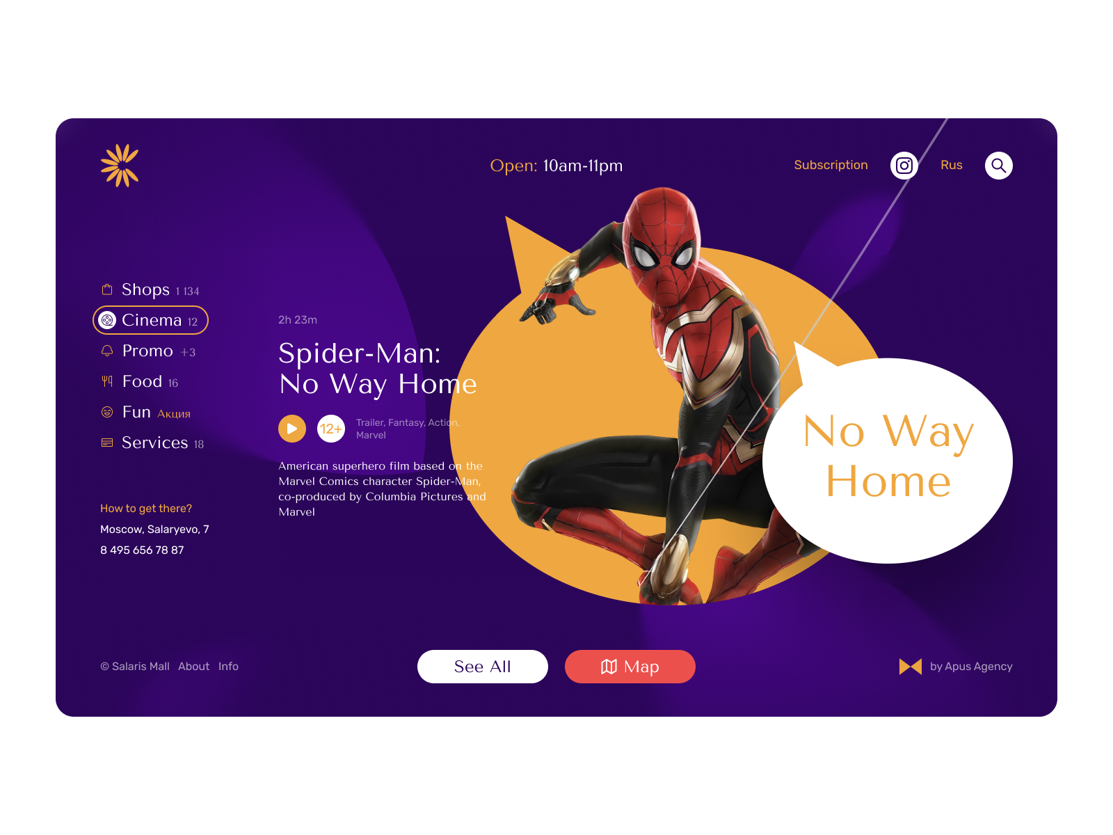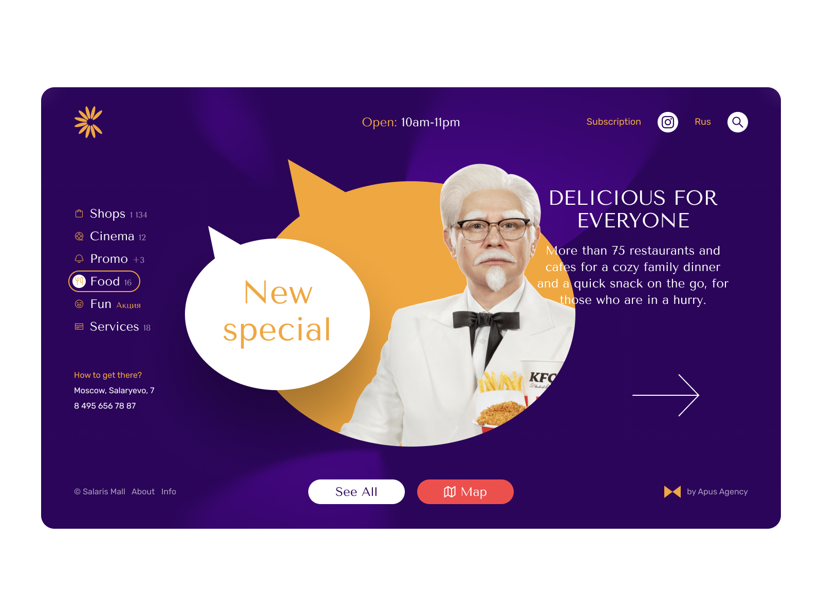 Salaris is a large shopping and entertainment center located in Salaryevo, New Moscow. By the opening of the mega mall, the agency, together with the client's team, created and launched a website with sections of shops, services, cinema, entertainments, interactive map and others.
