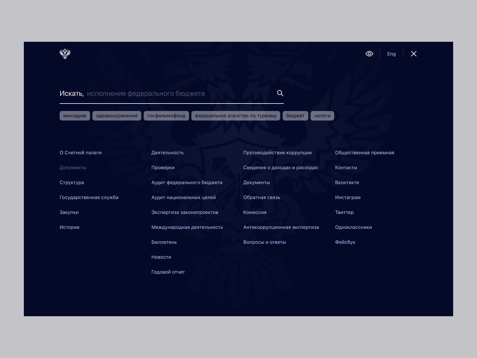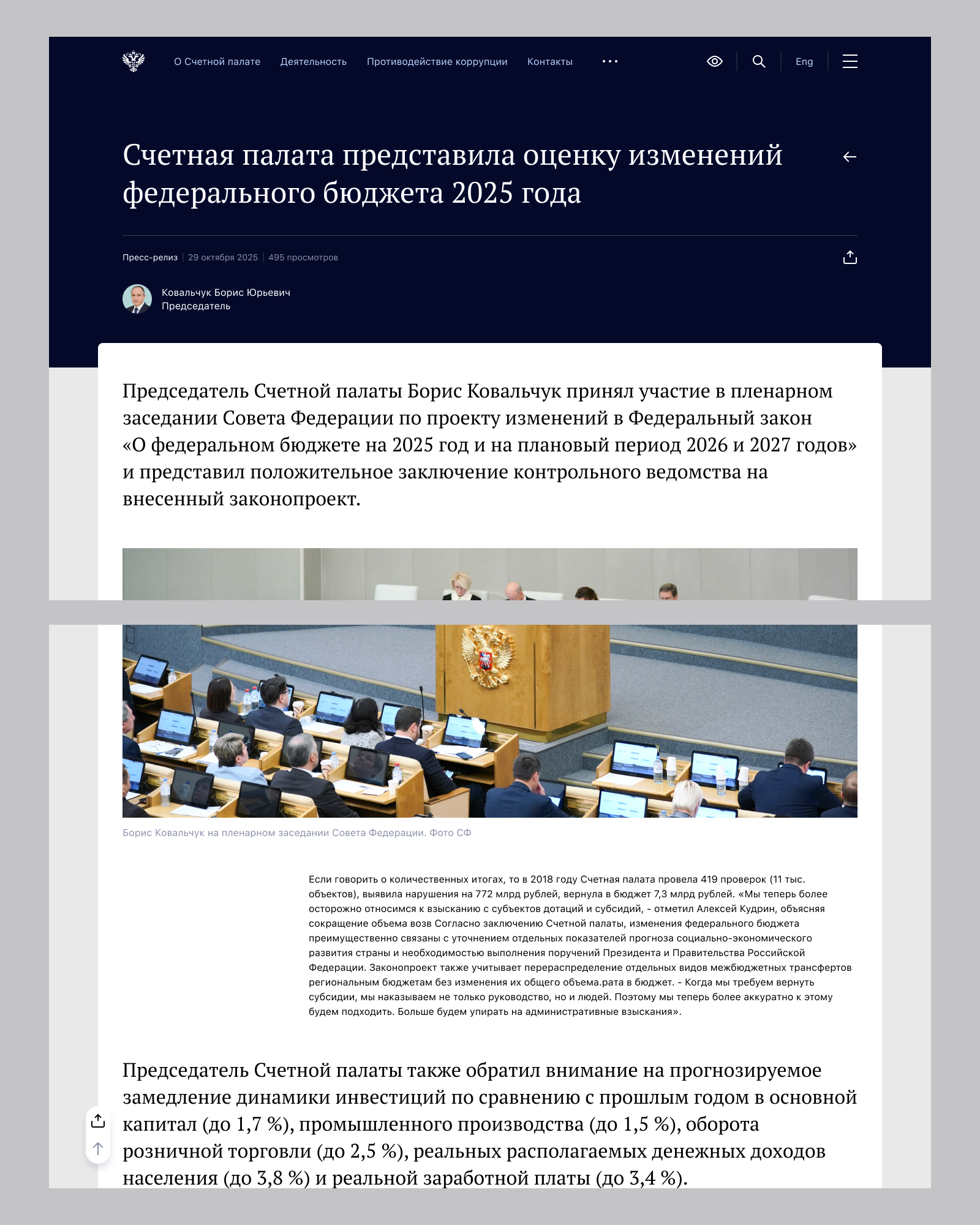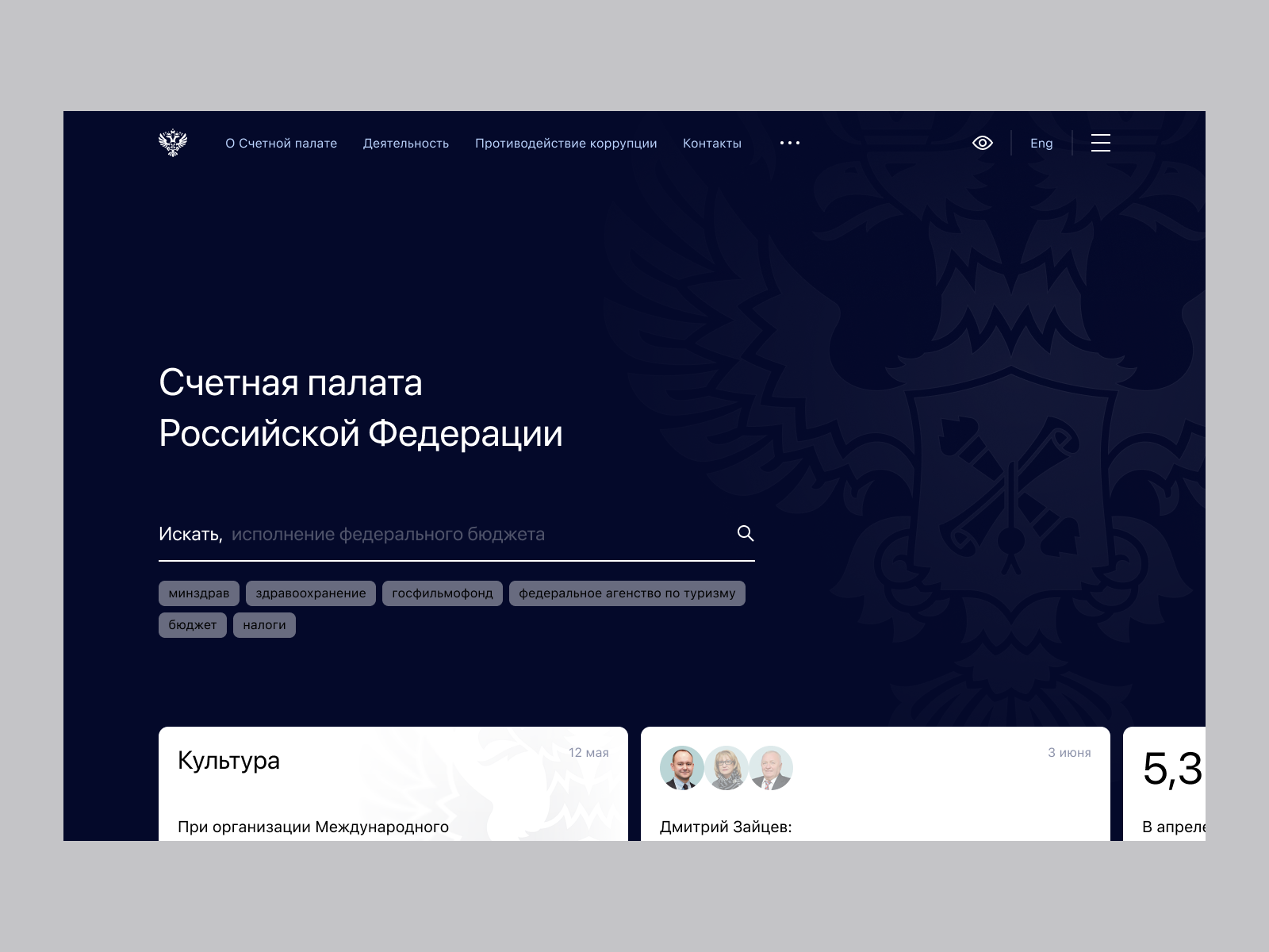 The Accounts Chamber performs an audit of budget funds and state resources in general. One of the strategic goals of this agency is to increase openness and accountability of the government agencies; and up-to-date and user-friendly website is critical for this purpose.