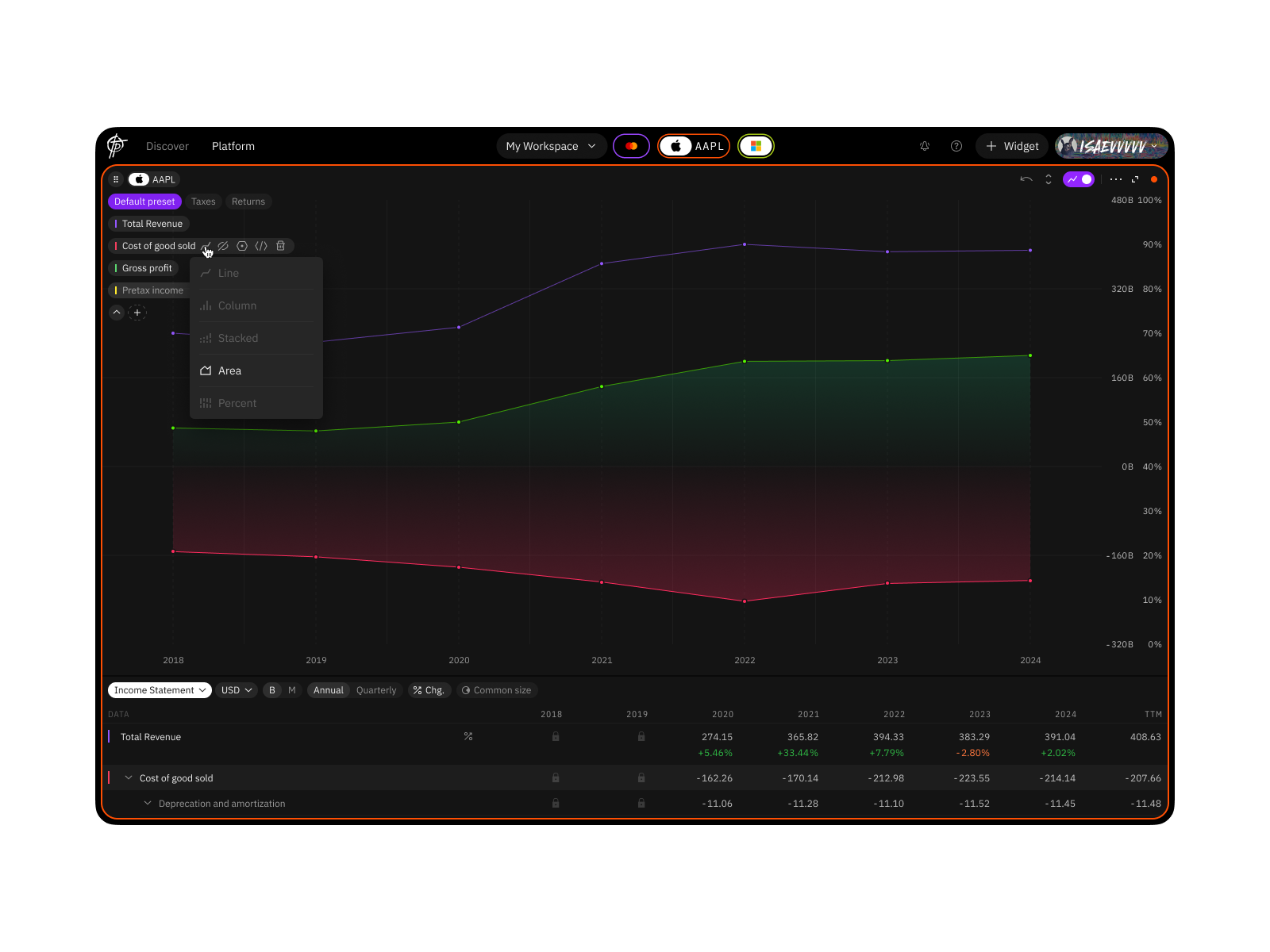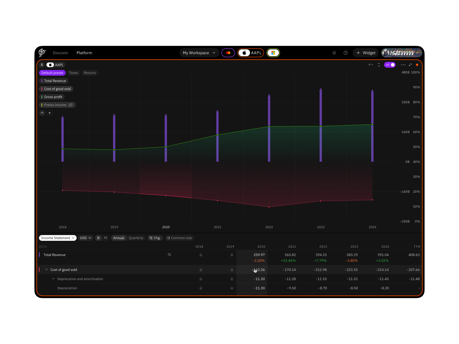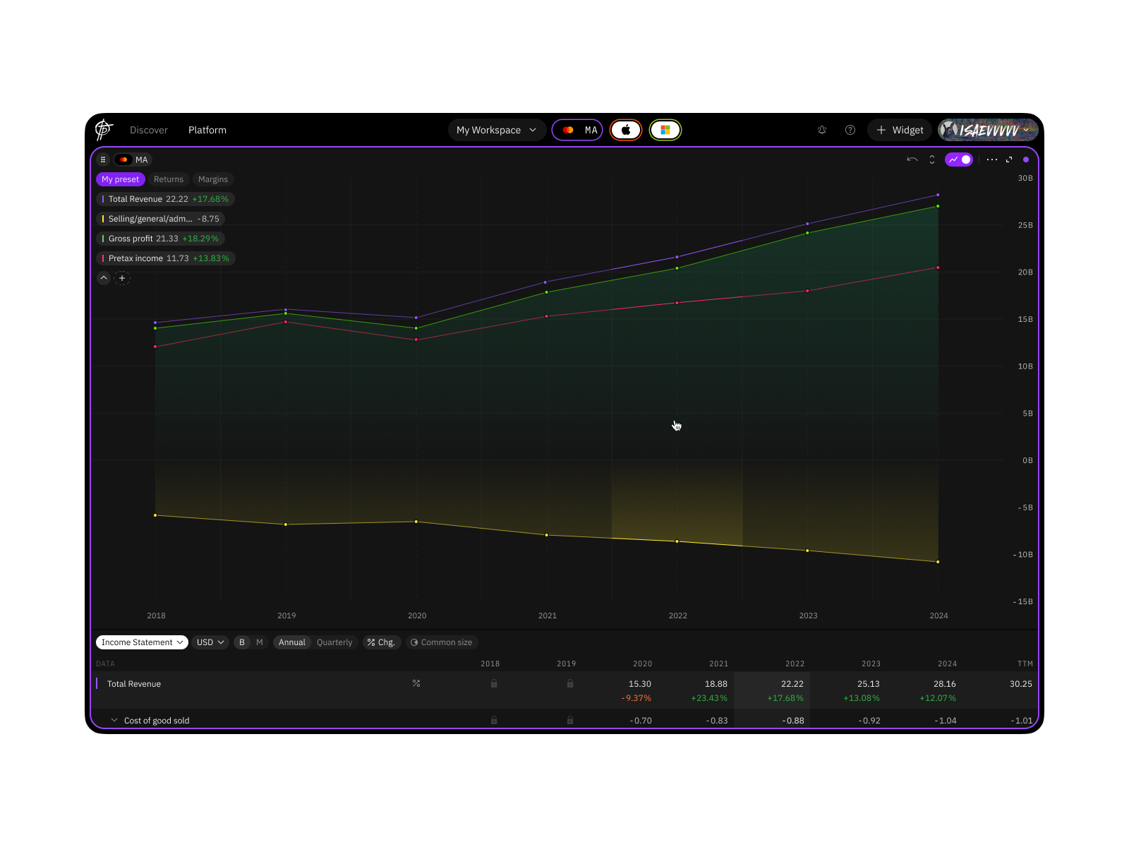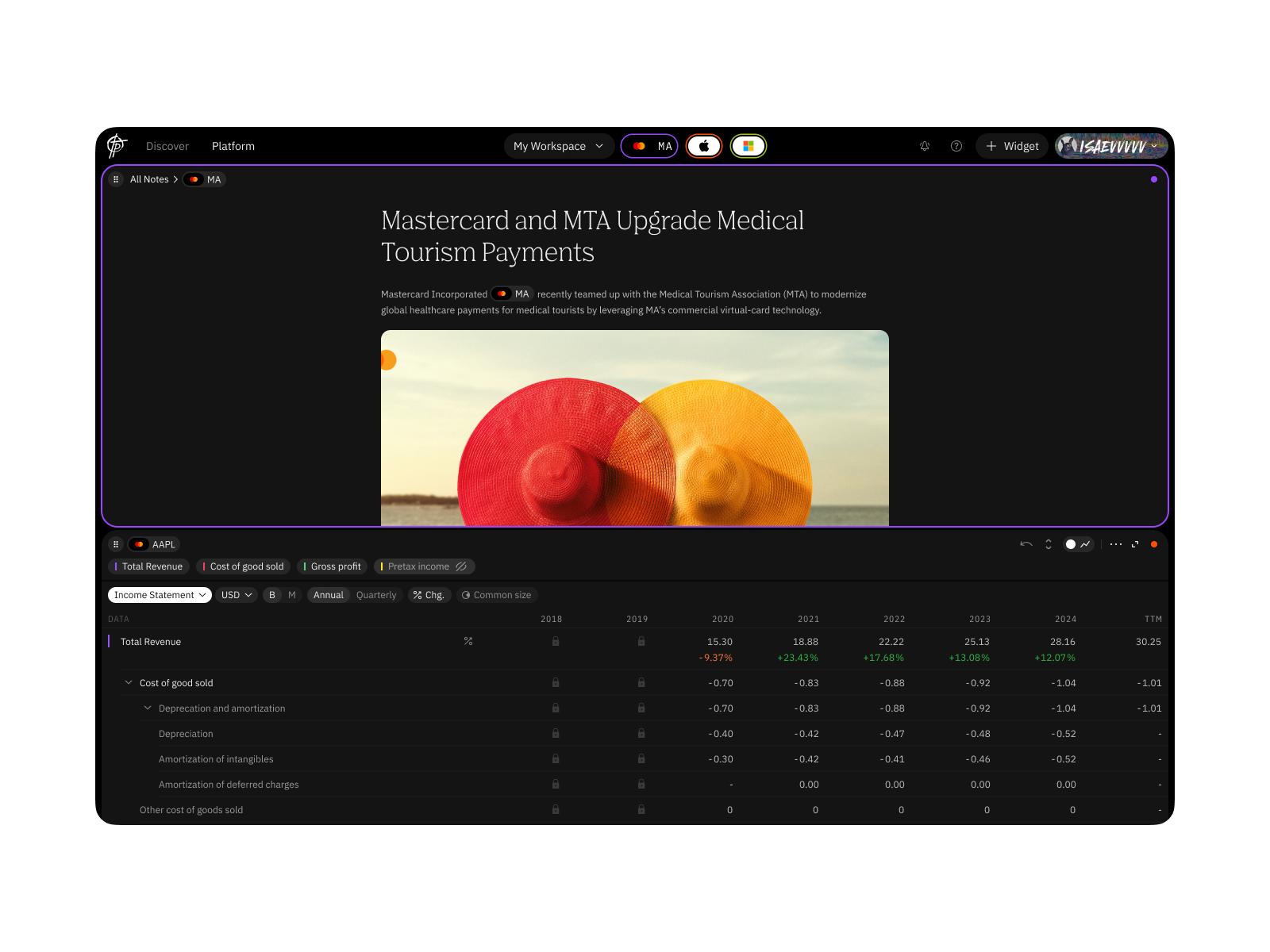 The Financials widget is a key part of the workspace. It combines a table with financial data and a dynamic chart, allowing users to simultaneously see the structure of indicators and their changes over time. When combined with the Notes widget, the Financials widget becomes a powerful tool for analytics and post creation.