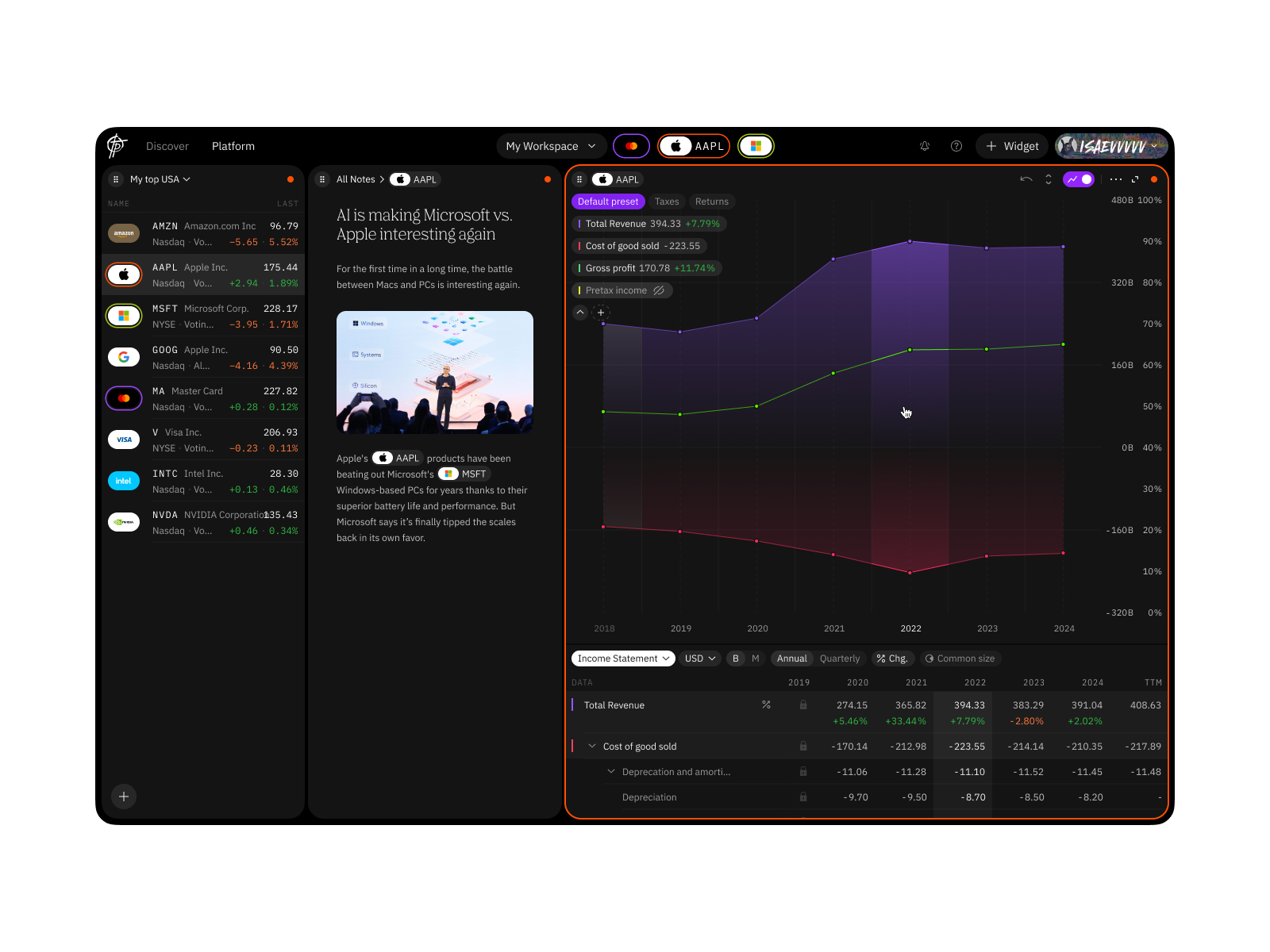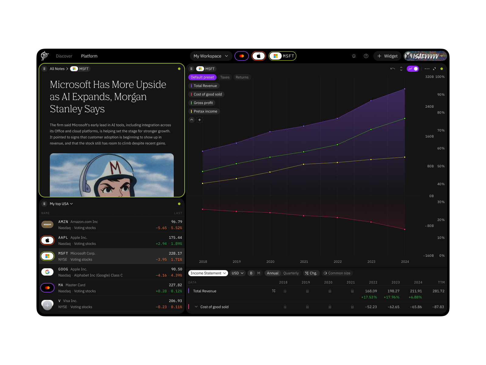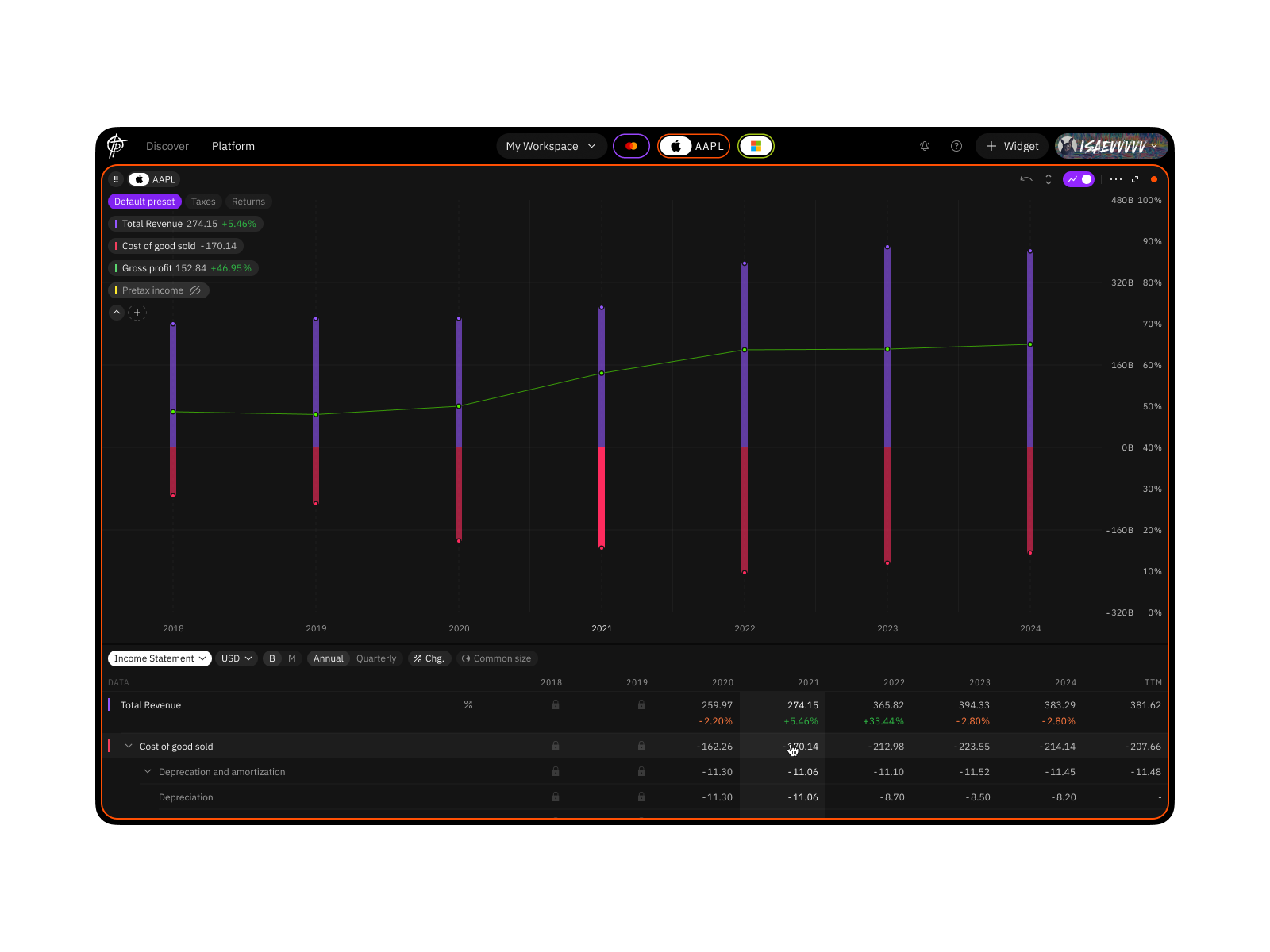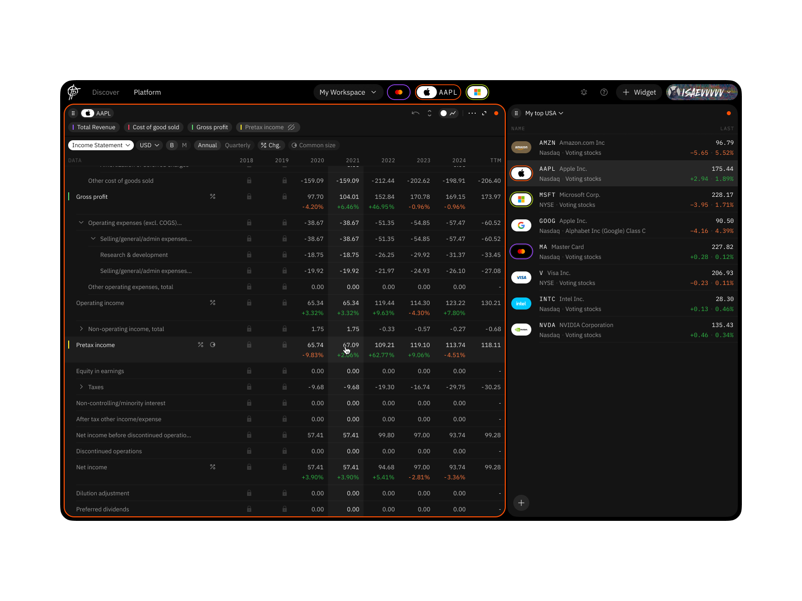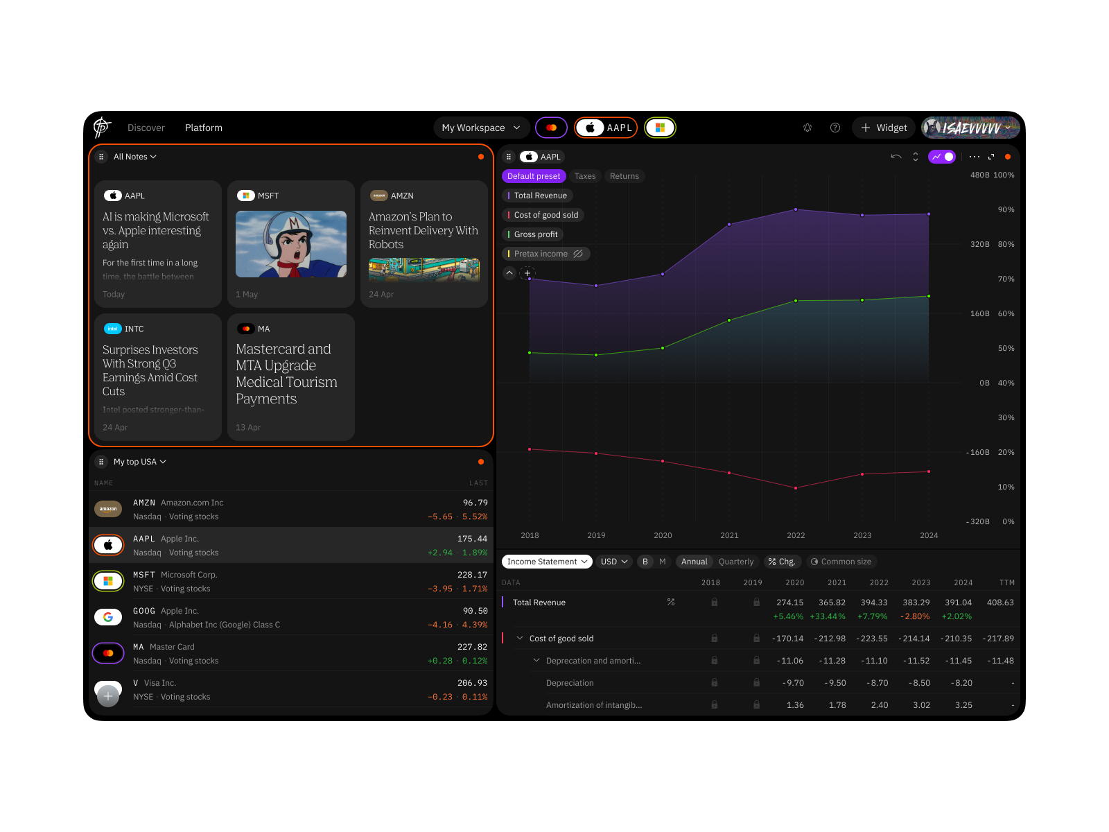 The Financials widget is a key part of the workspace. It combines a table with financial data and a dynamic chart, allowing users to simultaneously see the structure of indicators and their changes over time. When combined with the Notes widget, the Financials widget becomes a powerful tool for analytics and post creation.