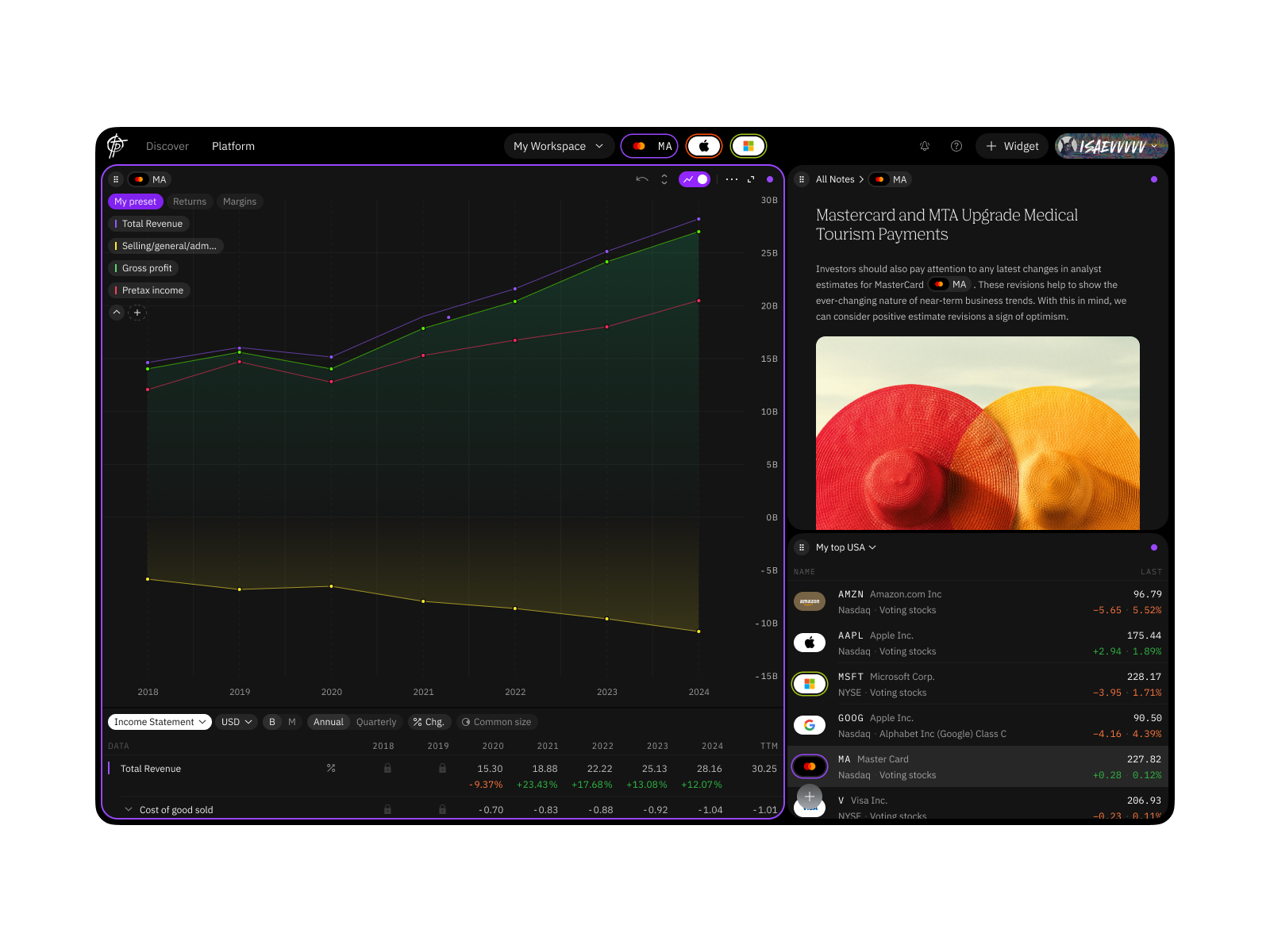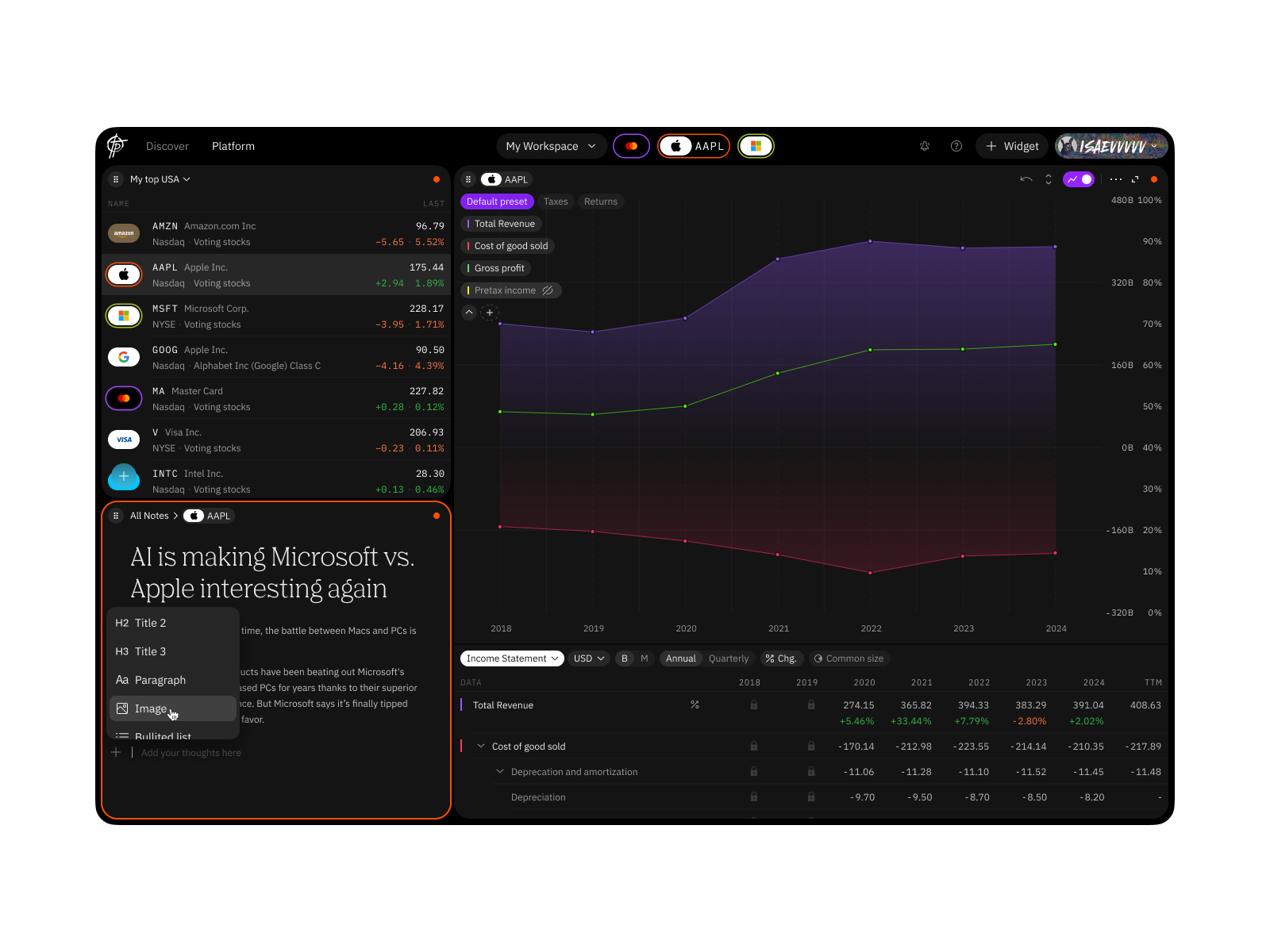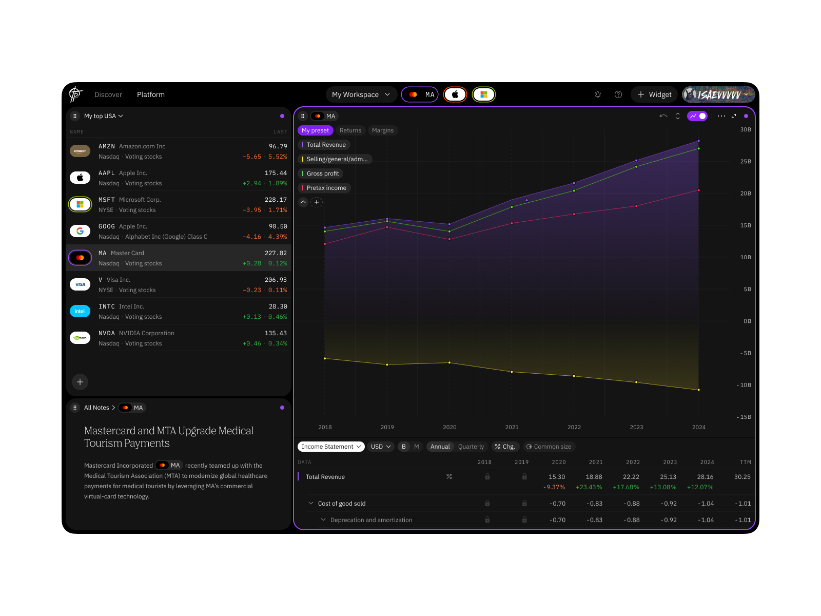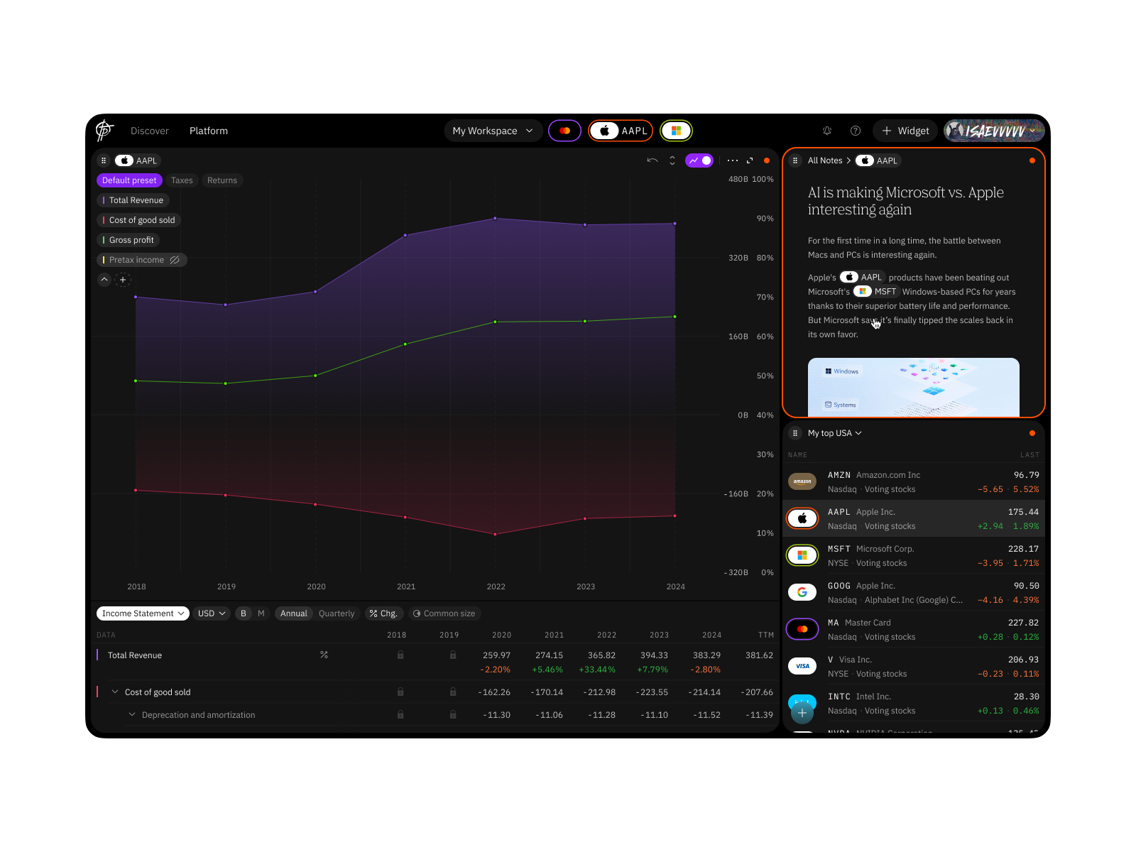 The Financials widget is a key part of the workspace. It combines a table with financial data and a dynamic chart, allowing users to simultaneously see the structure of indicators and their changes over time. When combined with the Notes widget, the Financials widget becomes a powerful tool for analytics and post creation.